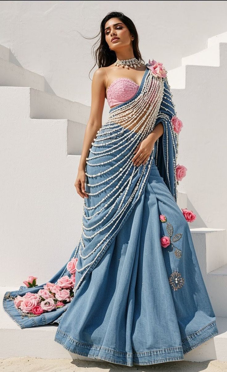 Elevate your ethnic wardrobe with this exquisite Denim Blue Pearl Draped Saree, a perfect blend of contemporary fashion and traditional elegance. Crafted in premium denim-inspired fabric, this saree is beautifully enhanced with cascading pearl chains that create a luxurious draped effect.