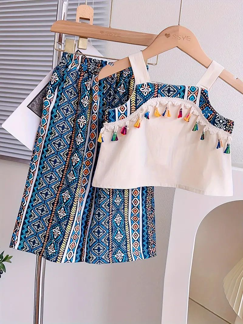 👗 2-Piece Set: Tassel-detailed top + printed skirt