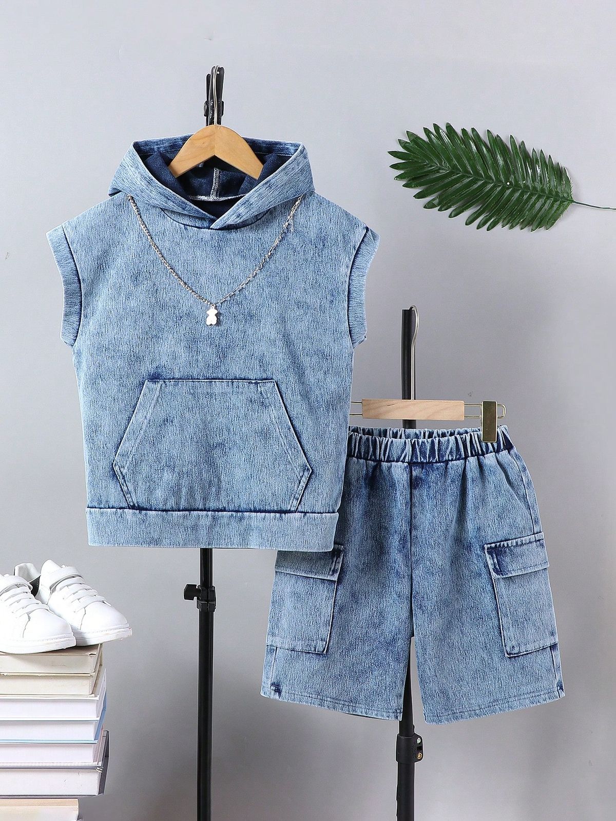 • 👕 2-Piece Set: Sleeveless denim hoodie + cargo shorts