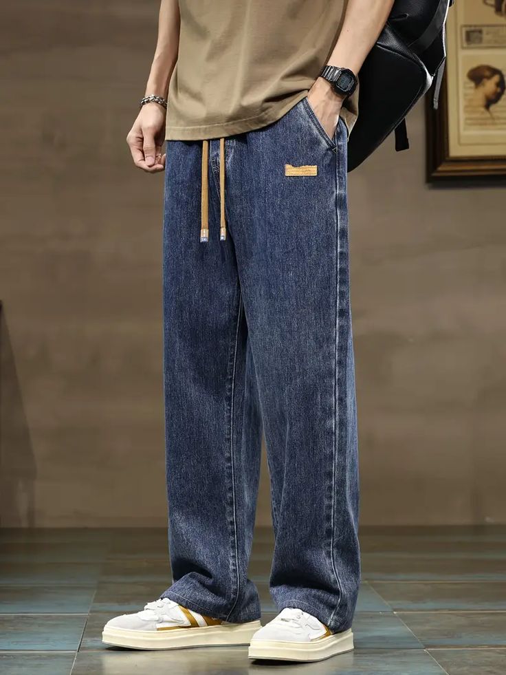 Men’s Dark Blue Wide-Leg Denim Pants – Relaxed Fit Drawstring Jeans