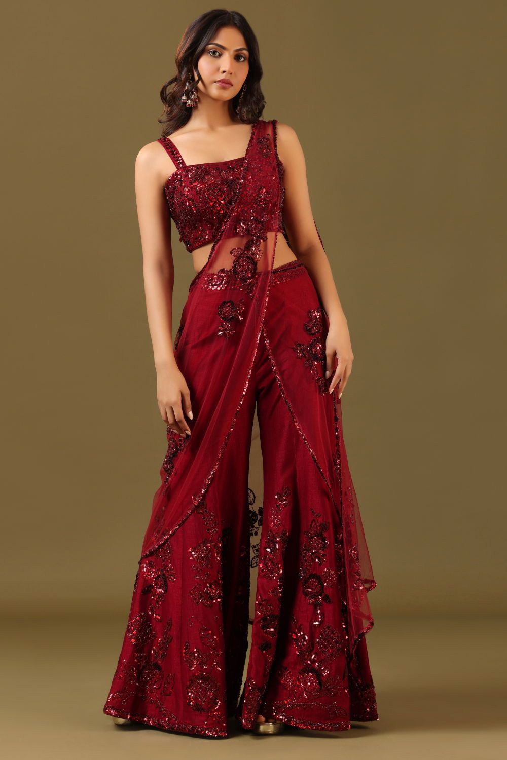 Elevate your occasion wear wardrobe with this striking Wine Red Embellished Saree Pant Set, designed for the modern woman who loves bold elegance. This contemporary ensemble reimagines the traditional saree with a stylish pant silhouette, offering both glamour and comfort.